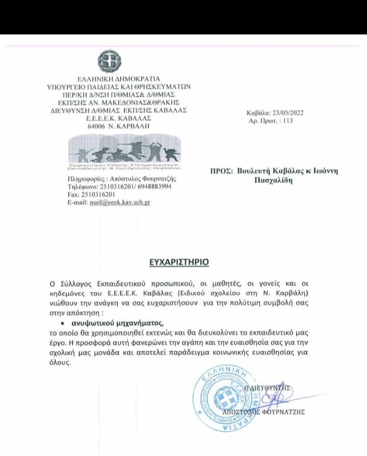 Σήμερα έλαβα τη συγκινητική επιστολή του ΕΕΕΚ Καβάλας η οποία αναγνωρίζει τον αγωνα μου για την απόκτηση ανυψωτικού μηχανήματος, το οποίο όπως διαβεβαιώνει ο διευθυντής κ. Απόστολος Φουρνατζής θα χρησιμοποιηθεί εκτενώς!\