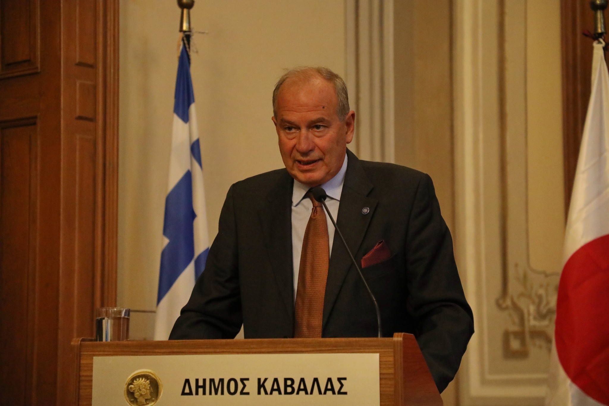 Εξοχότατε κ. Πρέσβη, καλωσορίσατε για ακόμη μια φορά στη πόλη μας. Μόλις πριν ένα χρόνο είχαμε τη χαρά να σας φιλοξενούμε εδώ, να σας ξεναγήσουμε στο Μουσείο Προσφυγικού Ελληνισμού. Επίσκεψη η οποία υπήρξε καταλύτης για τη συγκεκριμένη εκδήλωση, καθώς στη μετέπειτα συνάντηση μας στη Πρεσβεία, ανάμεσα στα τόσα ενδιαφέροντα που συζητήσαμε για τη περαιτέρω σύζευξη των σχέσεων μεταξύ μας με σκοπό την ανάδειξη και προβολή της Π.Ε. Καβάλας και των προϊόντων της, μου εκφράσατε την επιθυμία να οργανώσουμε μαζί μια εκδήλωση προς τιμή του καπετάνιου και του πληρώματος που έσωσαν εκατοντάδες πρόσφυγες στη Σμύρνη. Ένα χρόνο μετά, είμαστε εδώ, κ. Πρέσβη.